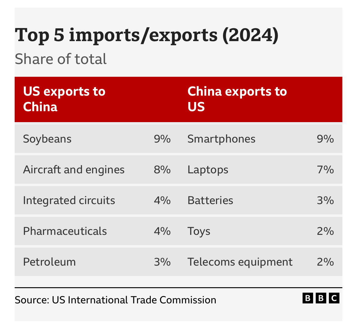In a word - lots. In 2024, the biggest category of goods exported from the US to China were soybeans – primarily used to feed China's estimated 440 million pigs. The US also sent pharmaceuticals and petroleum. Meanwhile, China exported large volumes of electronics, computers and toys. The biggest category of US imports from China is smartphones, accounting for 9% of the total. A large proportion of these smartphones Apple iPhones made in China.